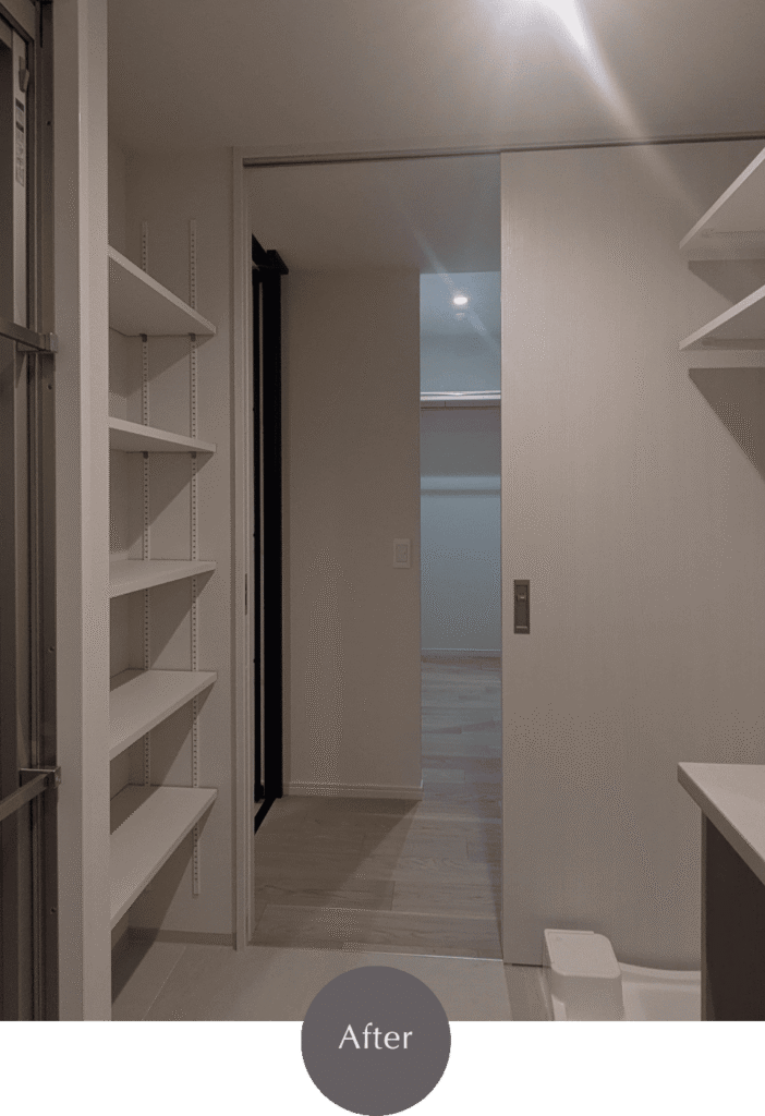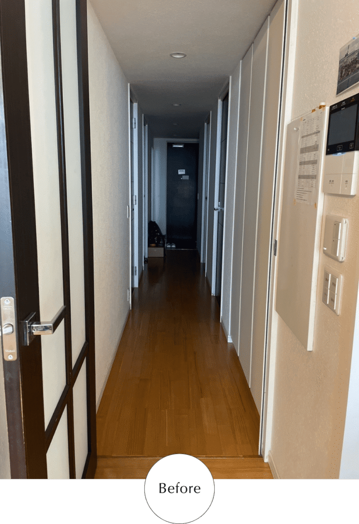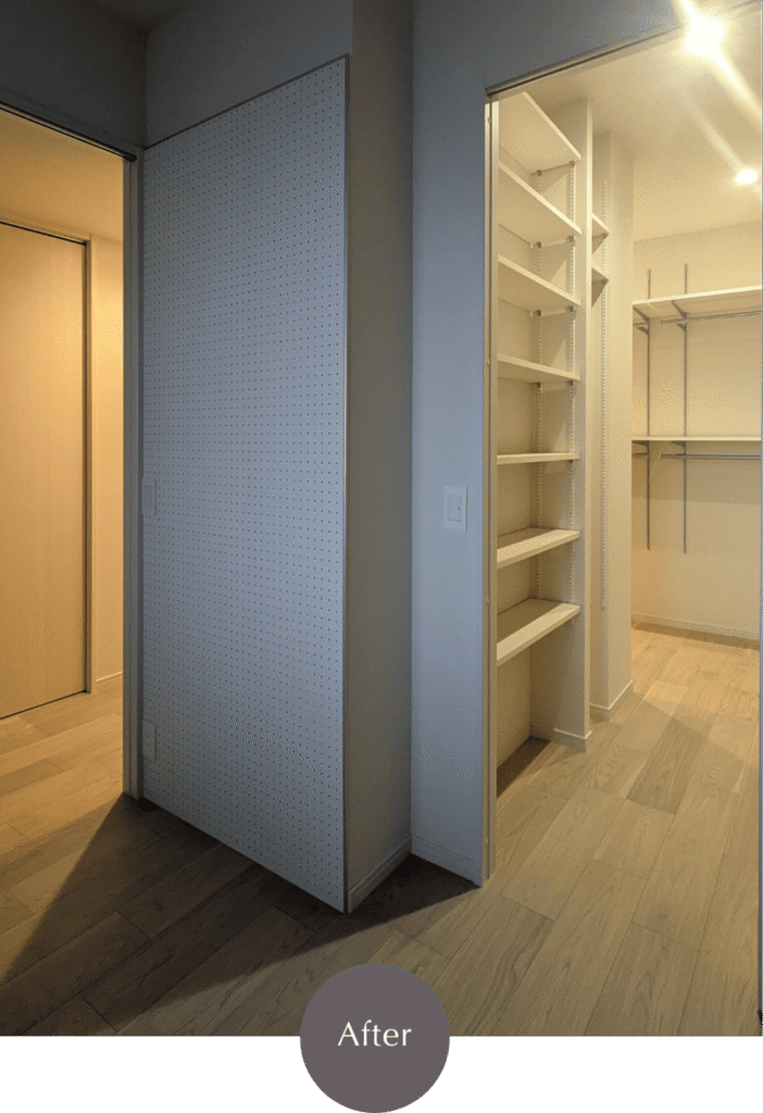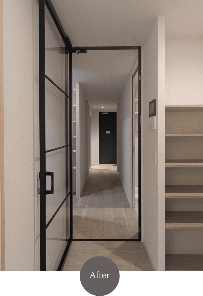 リビングへの入口扉を玄関側に移動させ、廊下にあった物入れをLDK側に取り込みました。