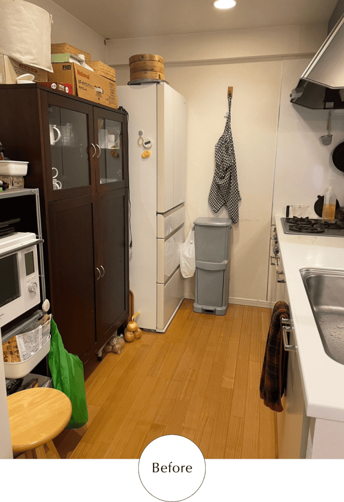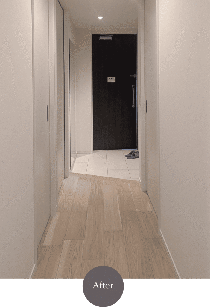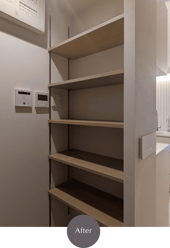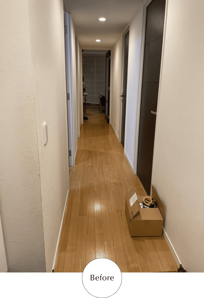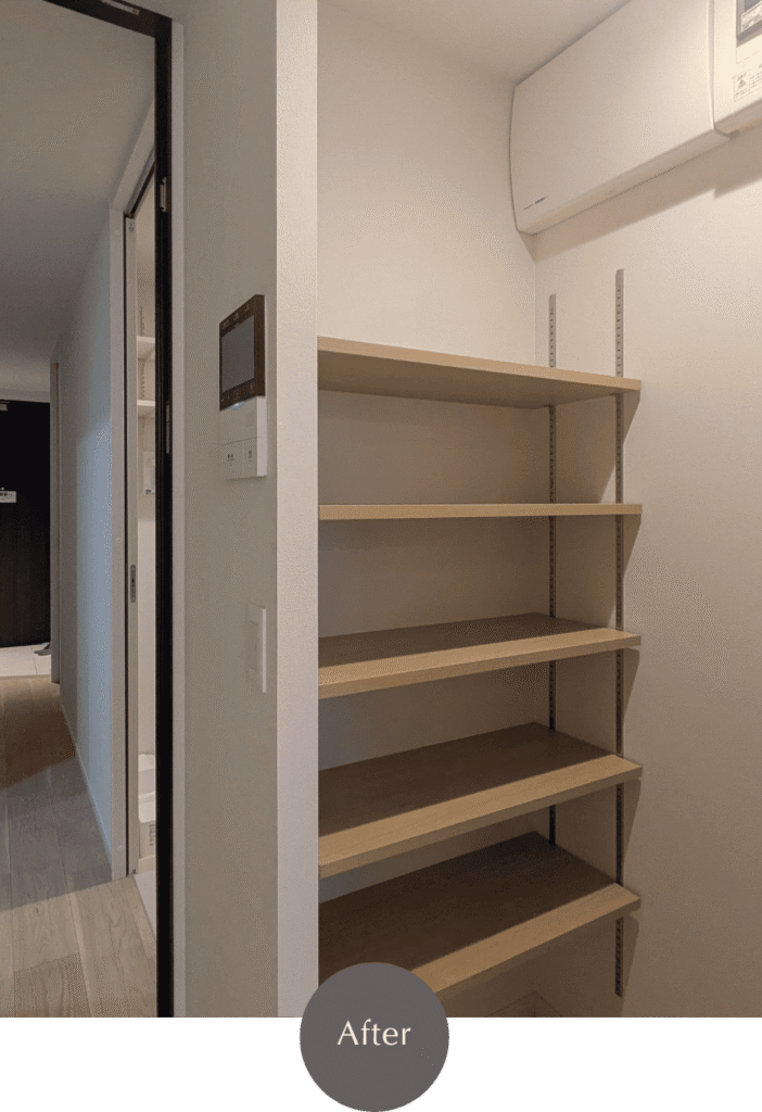 リビングへの入口扉を玄関側に移動させ、廊下にあった物入れをLDK側に取り込みました。