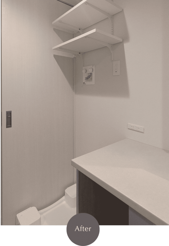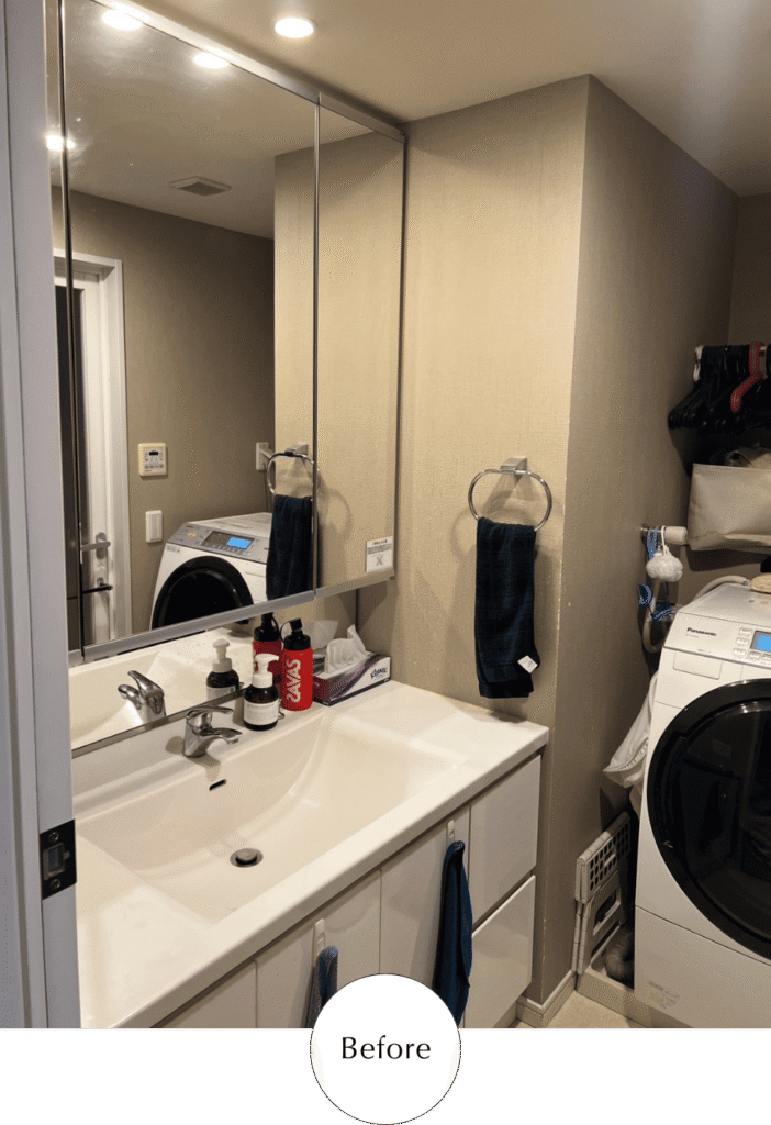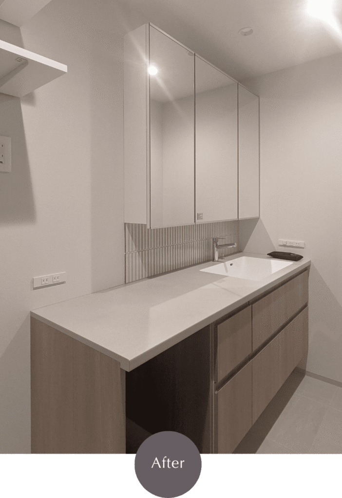 洗面脱衣室には可動棚を設置。家族が並んで身支度できる、ゆとりある空間に生まれ変わりました。