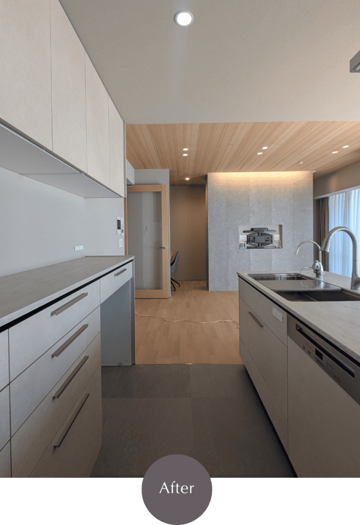 以前のL型キッチンから、開放感のあるペニンシュラ型へ。