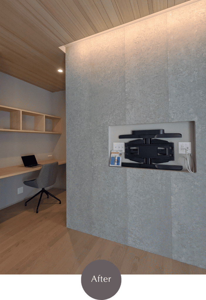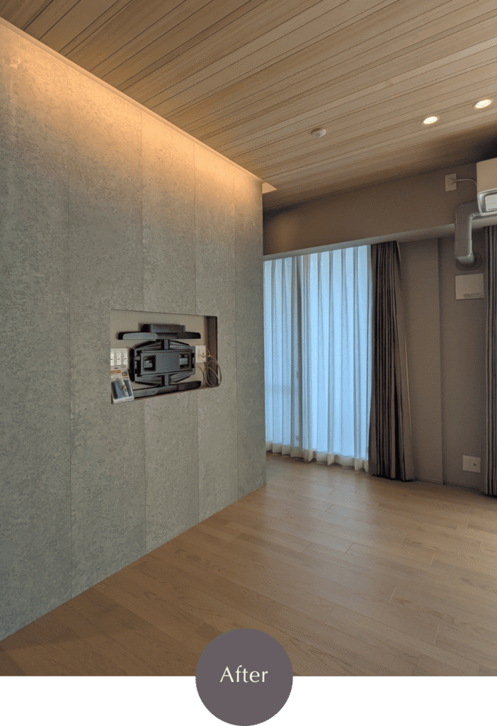 印象的なグレーの間仕切り壁は、壁掛けTV用に工夫を施しました。TVボードを置かないことで、空間がすっきりと広く感じられます。