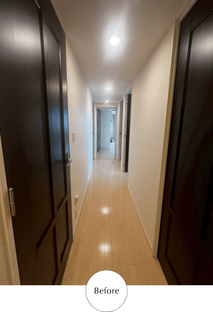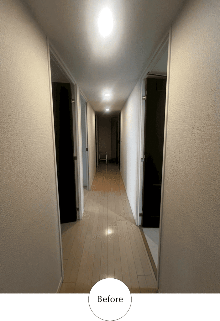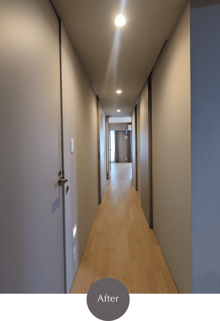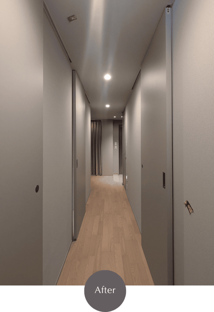 扉が壁に溶け込むことで、視線がすっと通り抜け、廊下全体に伸びやかな印象が生まれます。