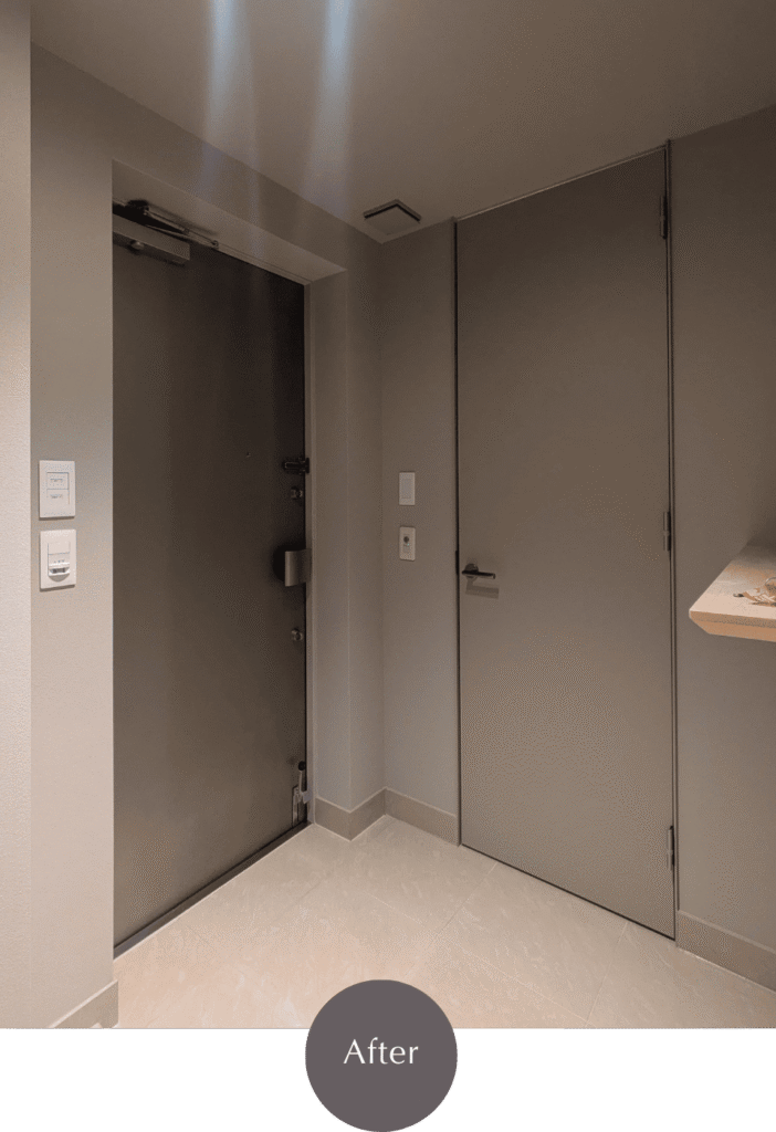 各居室や水回りへ続く扉を、壁に近い色合いの仕上げ材で統一しました。