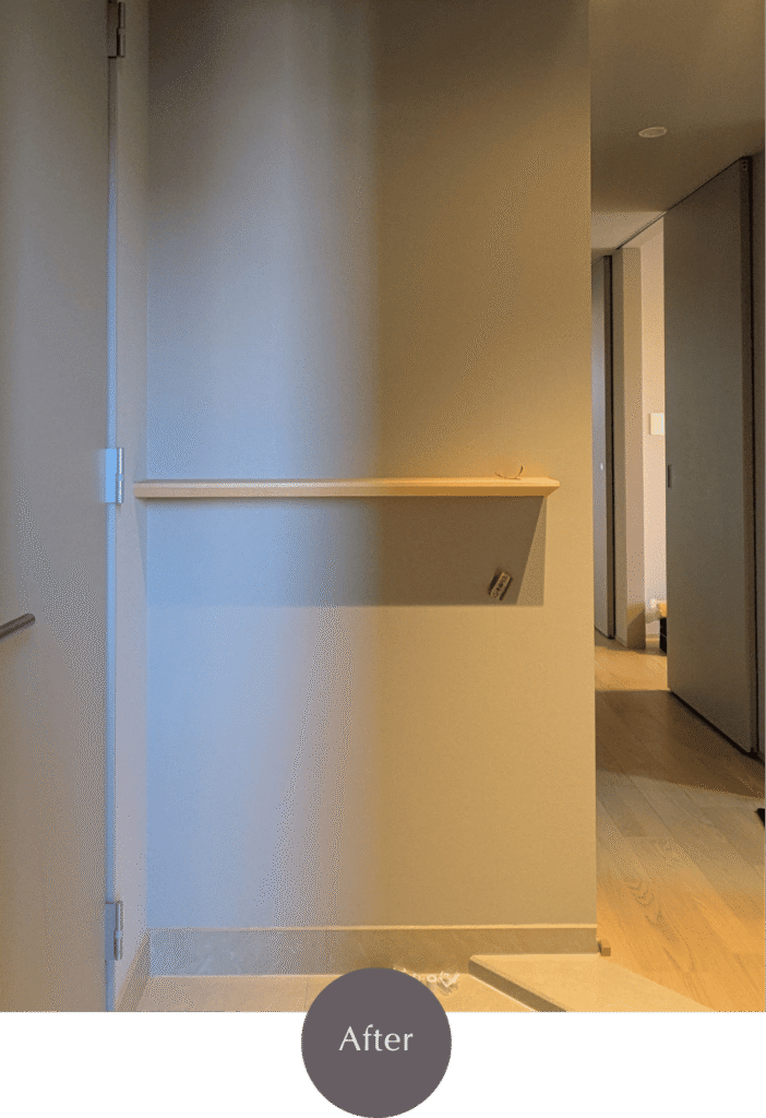 正面の壁には、鍵や携帯電話、ディフューザーを置ける飾り棚を設置。