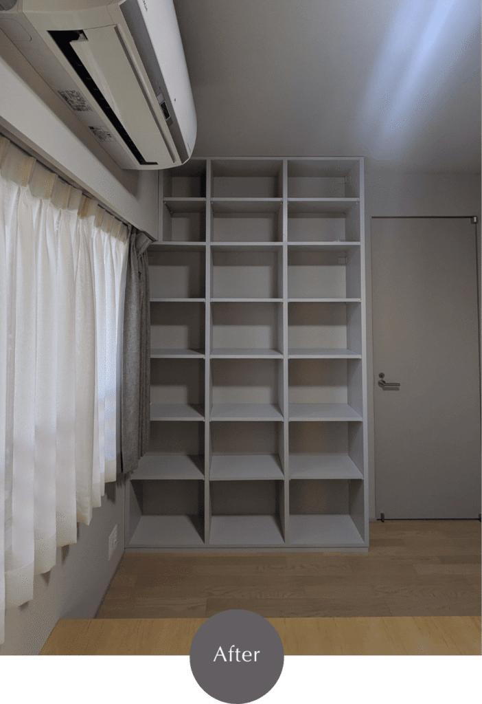 南海プライウッド製の収納システムに、一部オーダーを組み合わせた、オリジナルの収納空間です。