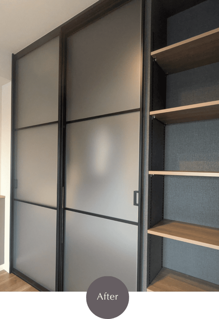 既存の吊り戸棚には、壁紙に馴染むシートを貼りました。