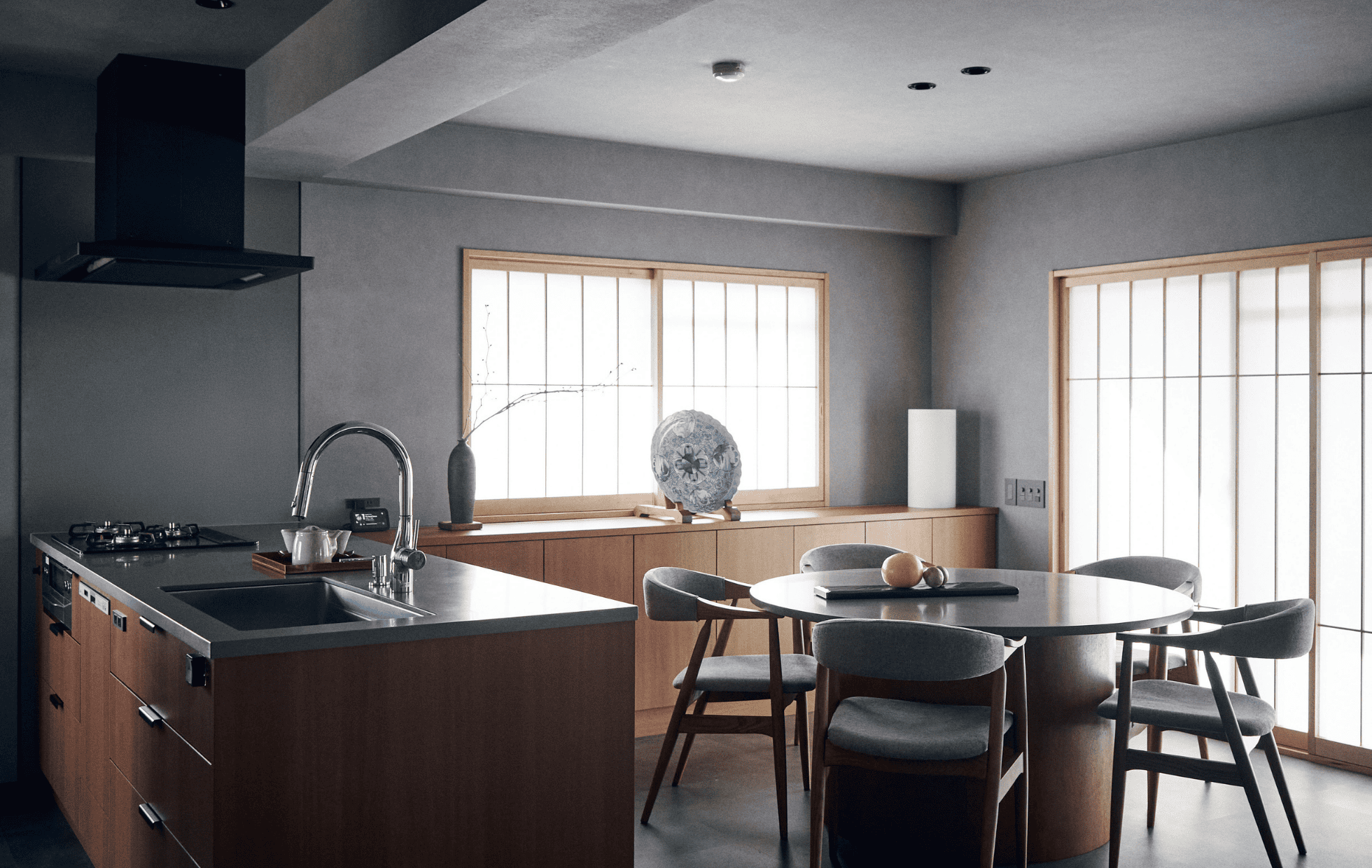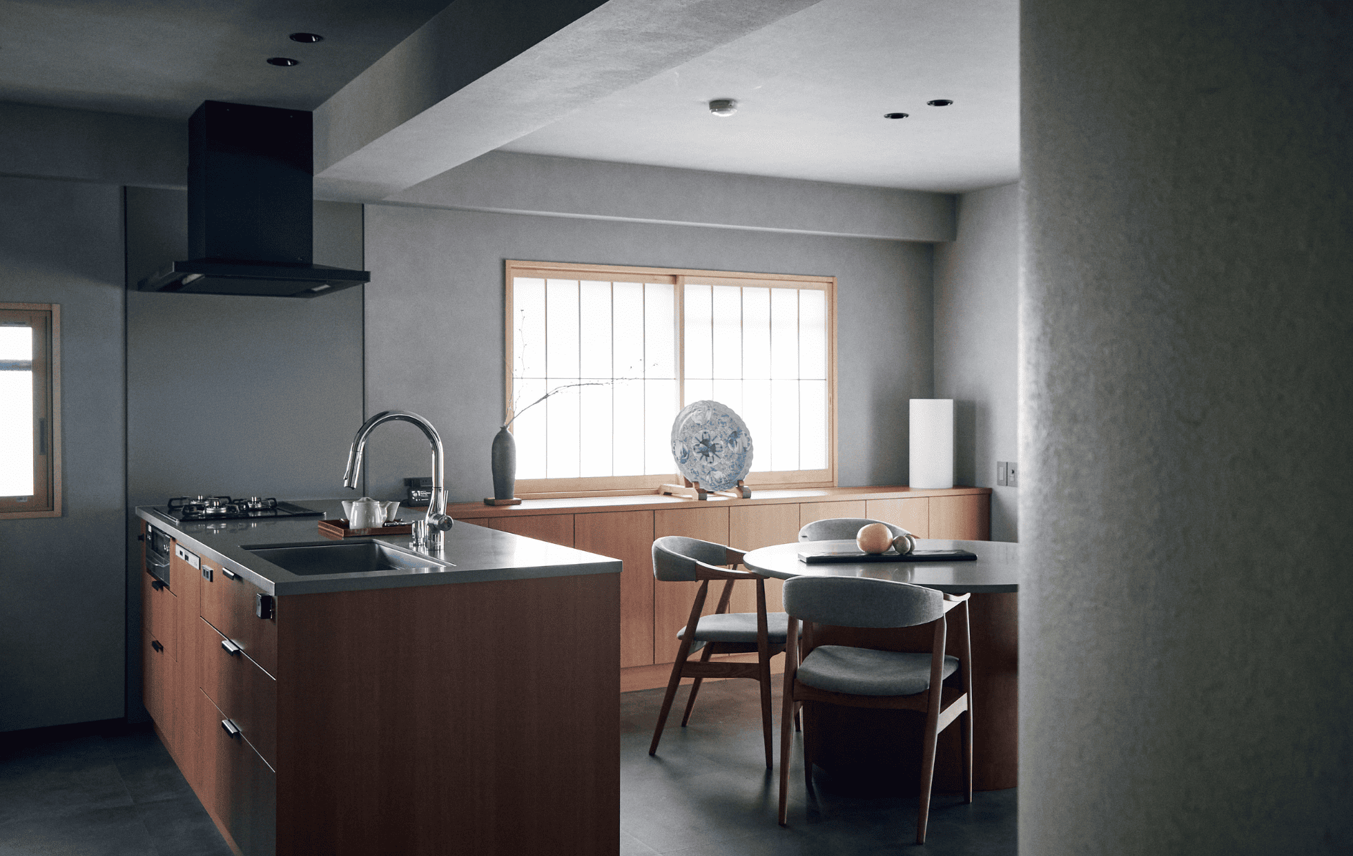 ペニンシュラキッチンと丸テーブルを中心に、家族や友人が自然と集まり、会話が弾む場所に。シンプルで落ち着いた佇まいの中に、暮らしのあたたかさが宿っています。