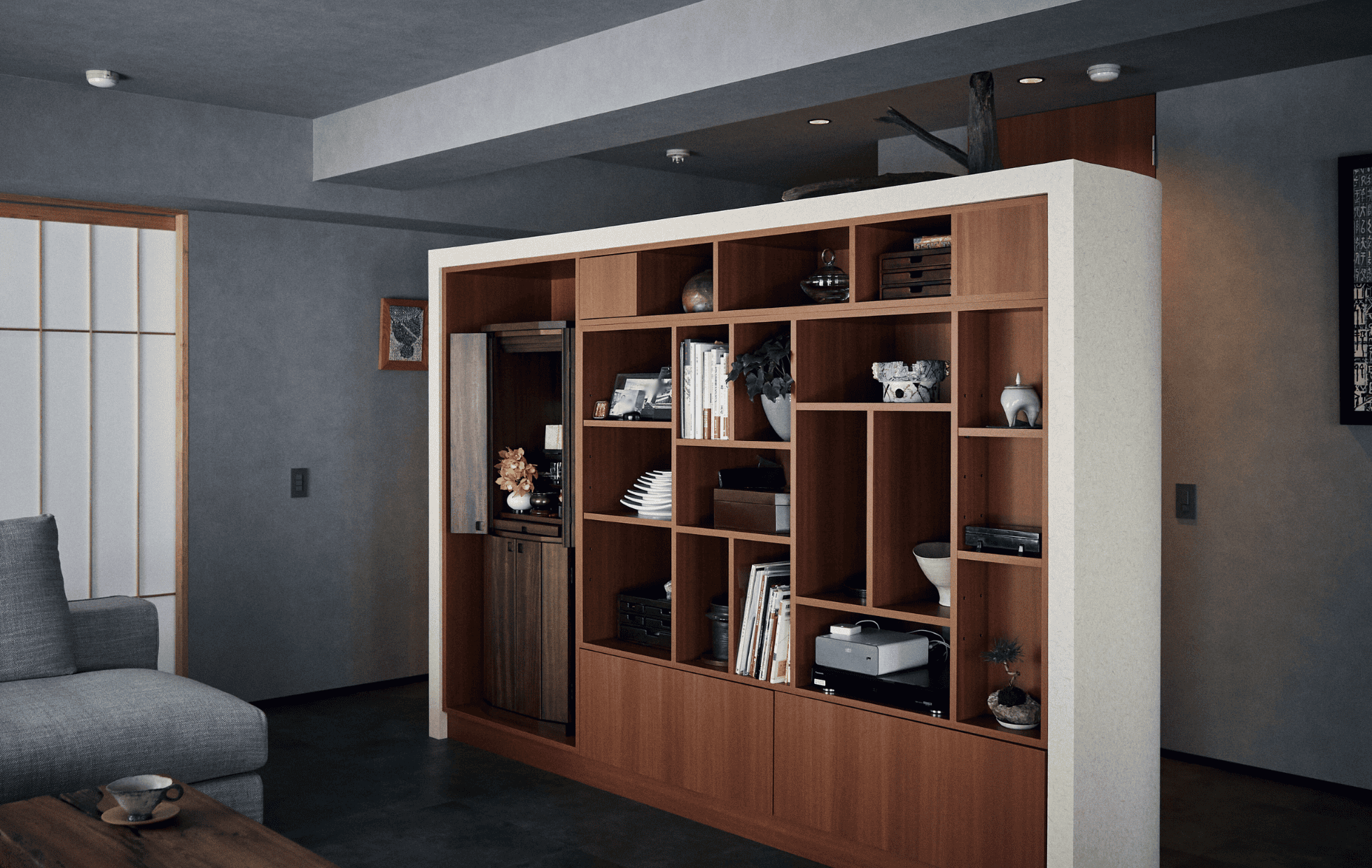 扉をなくした1LDKは、光が奥まで届く、ひとつながりの伸びやかな空間に。R仕上げの造作収納が空間をやわらかく整え、好きな絵や雑貨をゆっくり眺められる余白も生まれました。