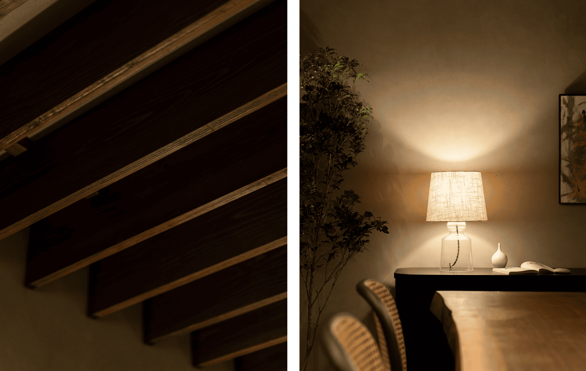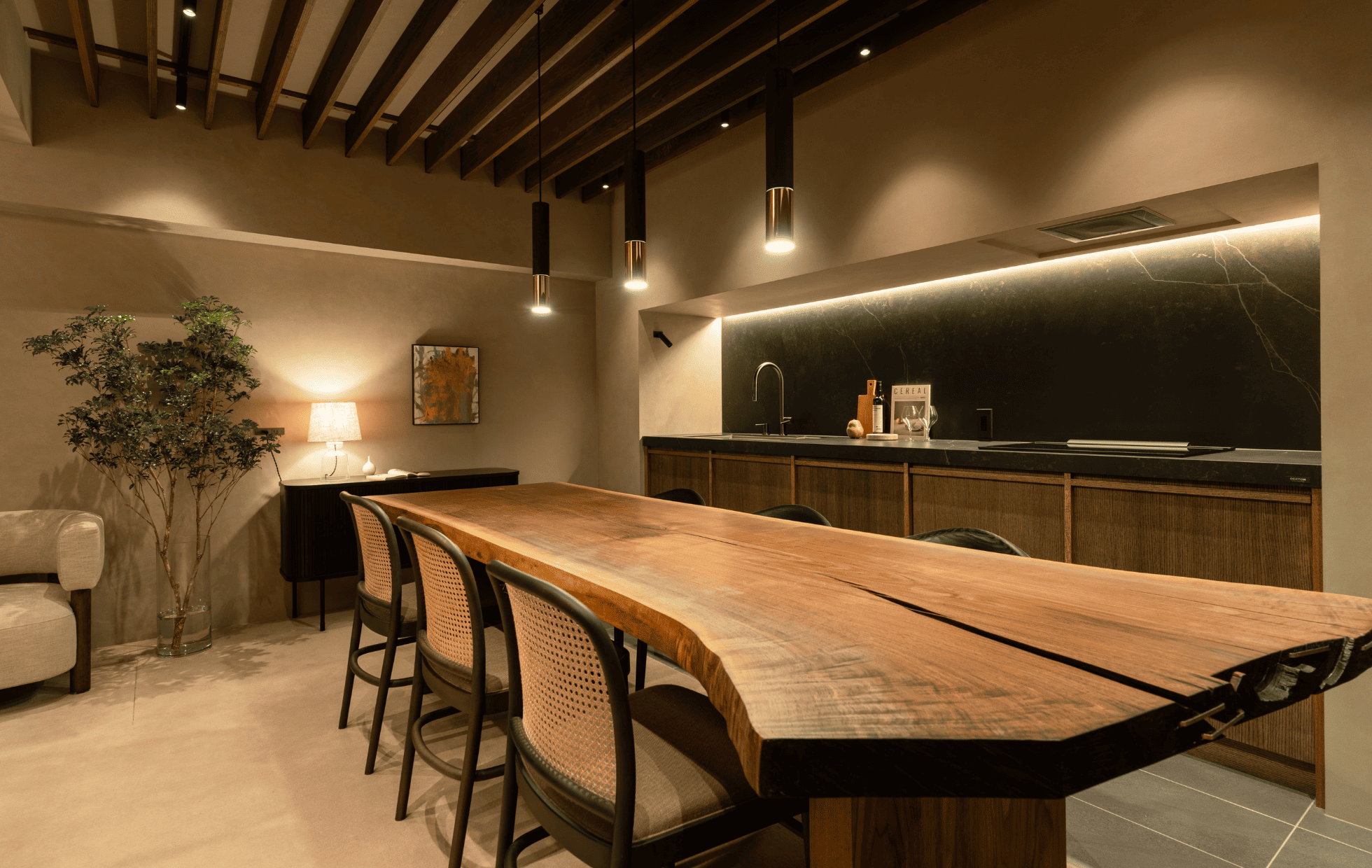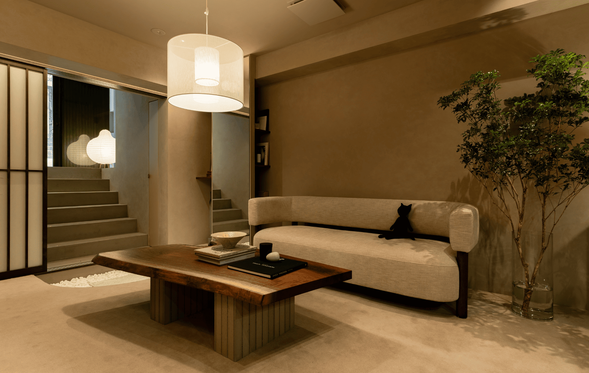 階段を降りると、静けさに包まれた隠れ家のような空間が広がります。