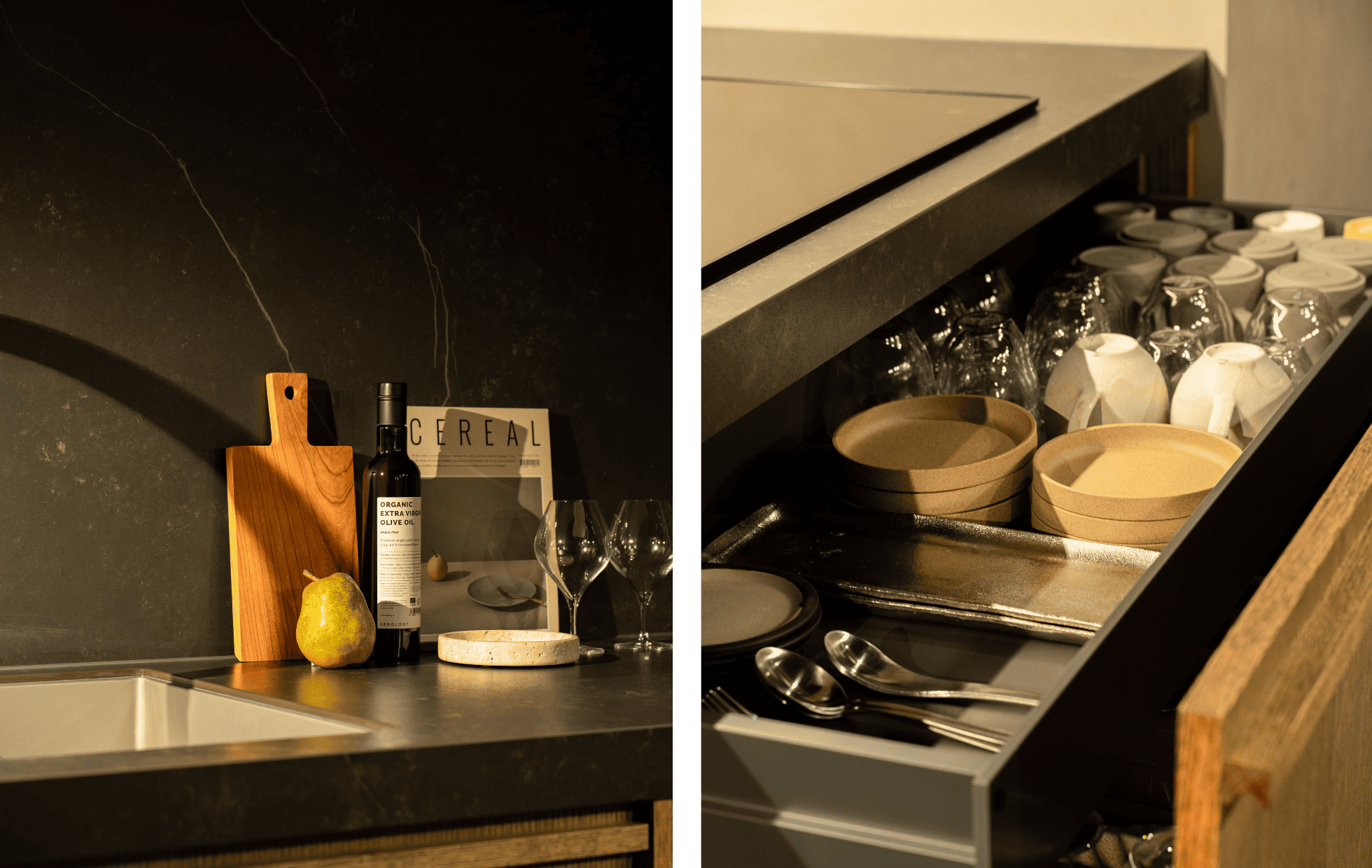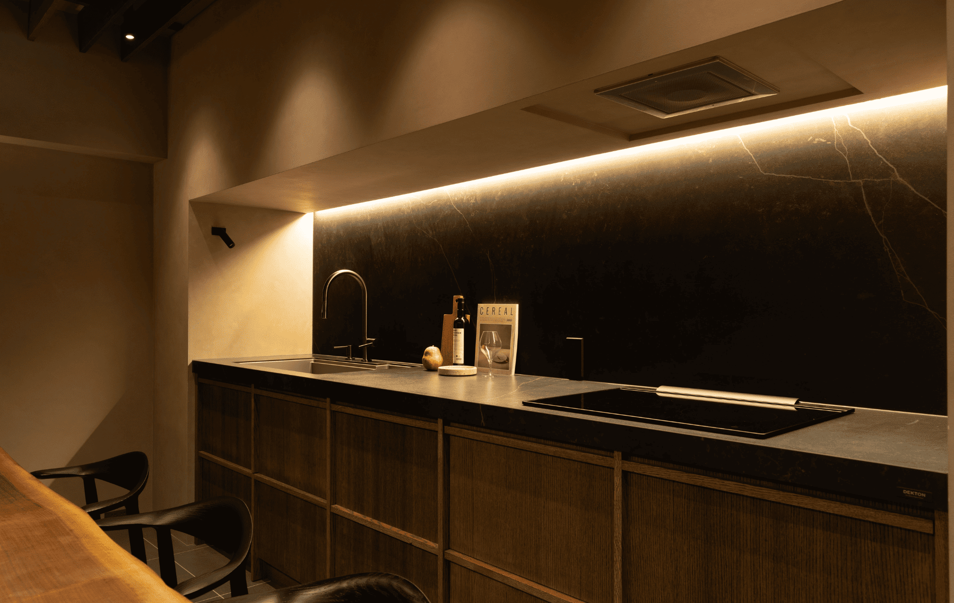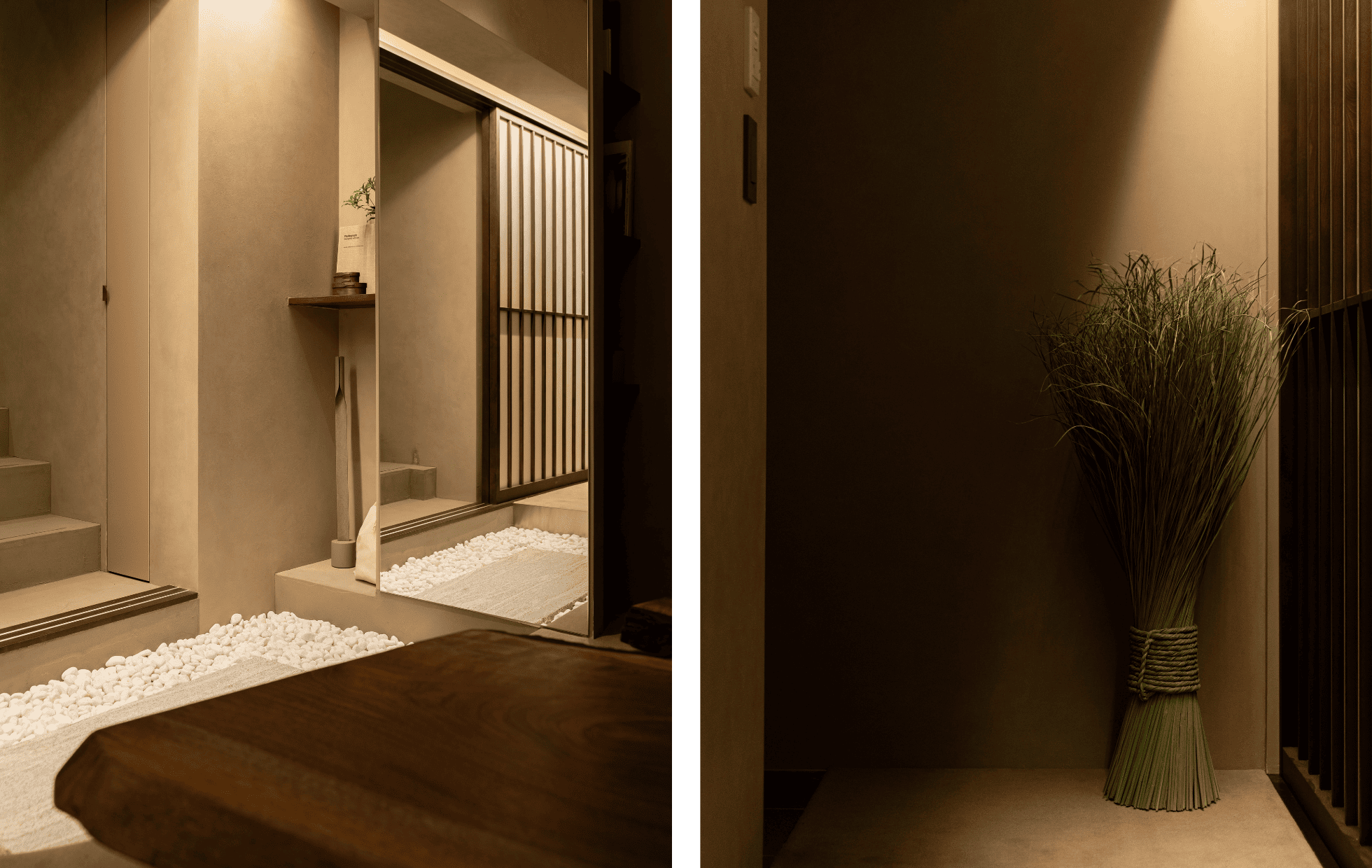 階段を降りると、静けさに包まれた隠れ家のような空間が広がります。