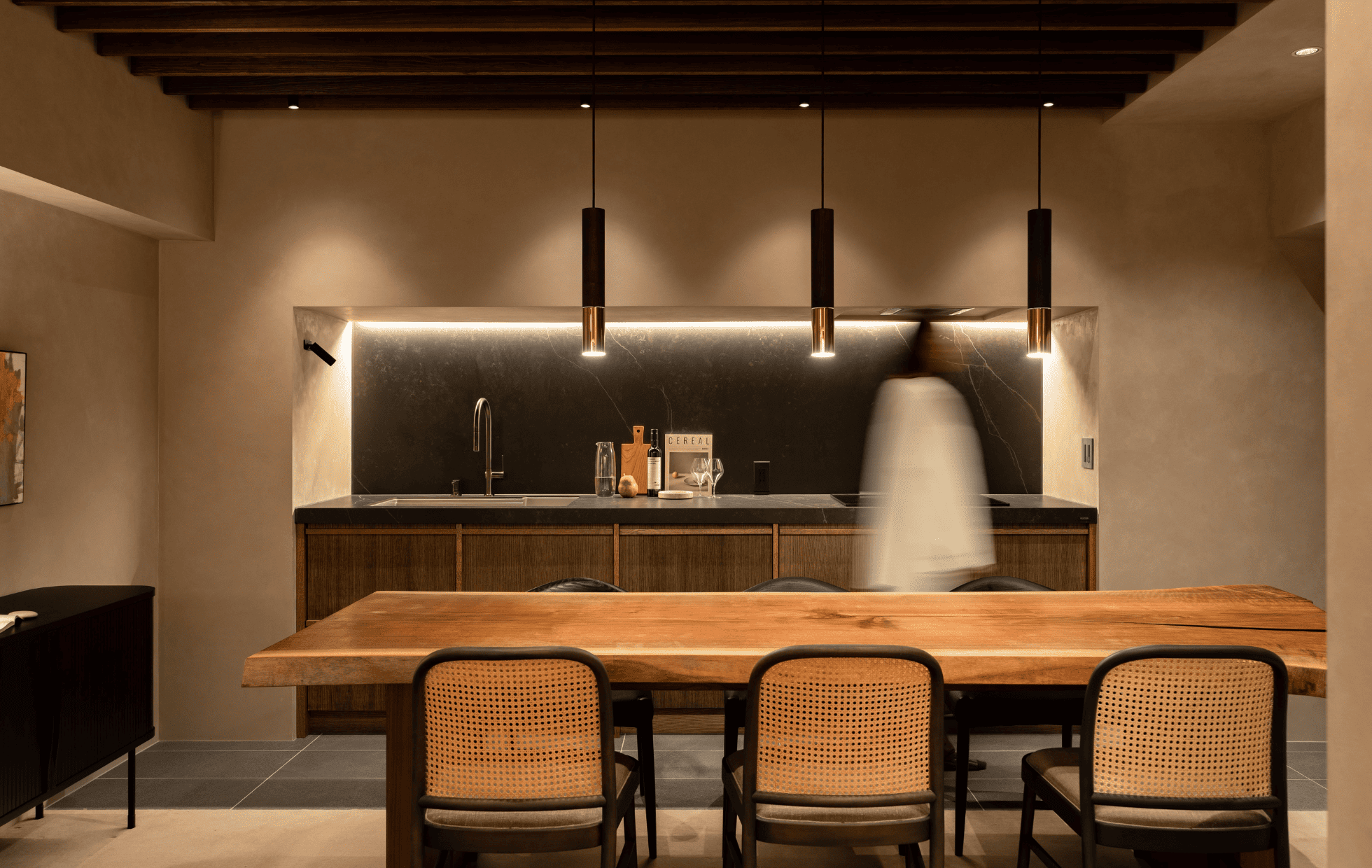 かつて暗かった空間は、暮らしの息づくLDKへ。家具のような佇まいの3mのI型キッチンと、大きな一枚板のテーブルが空間の主役です。